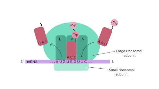 An aminoacyl-tRNA binds to the vacant A site on the ribosome. Ribosomes are made of two subunits. Small and big subunits are the two types of subunits 30S and 50S in bacteria.